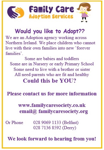 Family care Adoption Services staff is experienced in all areas of Adoption, Concurrency and Post Adoption work. We also provide a Big Lottery funded Life Story Project for Adopted children and children raised in Care across Northern Ireland, and are involved in providing a counselling, support and contact service to birth family members who have lost a child to Adoption in association with a partner Agency, Adoption Routes.